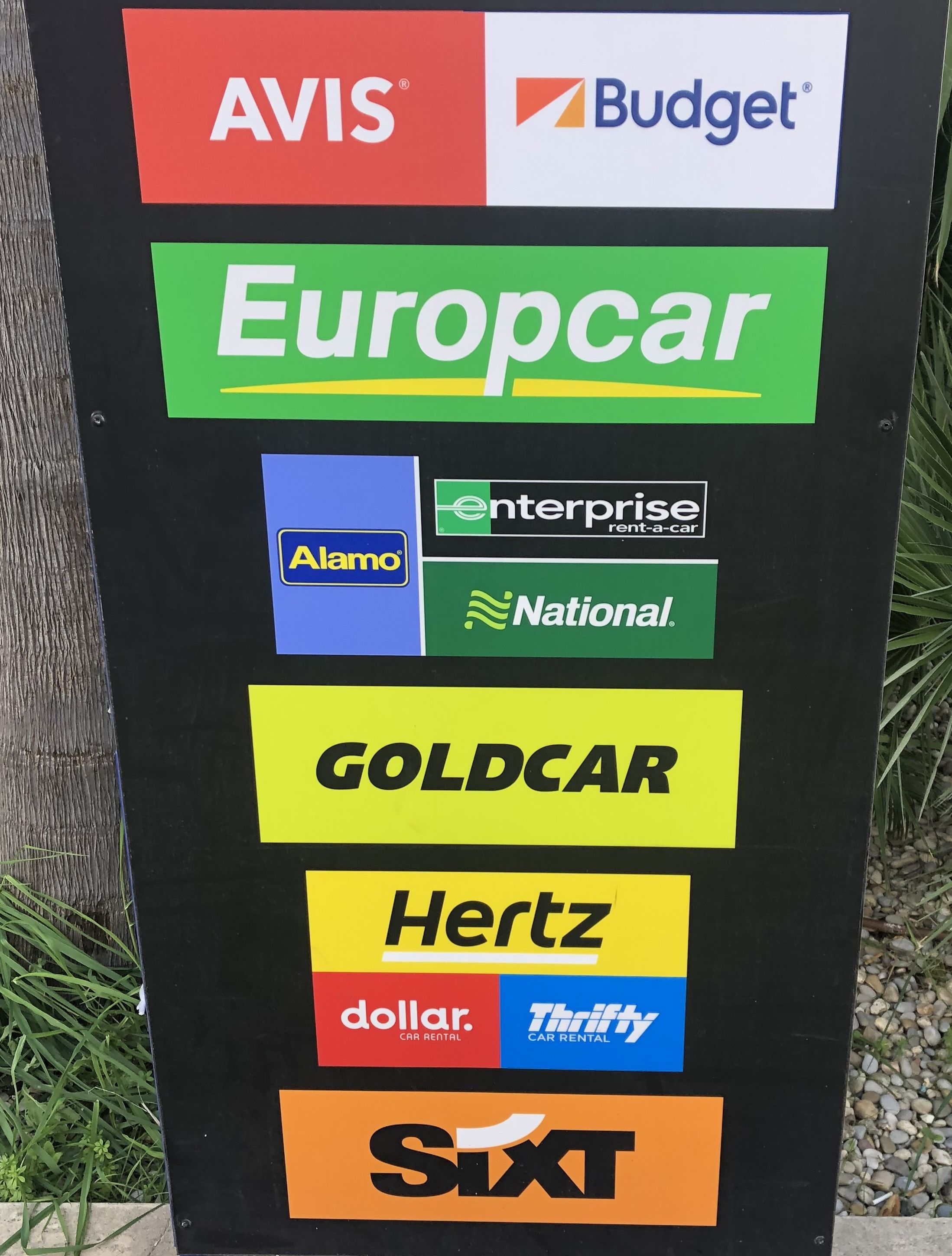 På billedet ses de udlejningsfimaer, som har fælles central i lufthavnen. Firmaernes priser ligger lidt over de øvrige udlejningsfirmaer, men de øvrige bilfirmaer kan undertiden være vanskelige at finde i lufthavnsområdet, ligesom deres åbningstider og service etc kan være mere tvivlsomme. Det kan derfor tilrådes at leje bil hos et hos et af de firmaer som vises på billedet